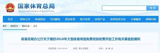 體育總局辦公廳關(guān)于做好2018年大型體育場館免費(fèi)或低收費(fèi)開放工作有關(guān)事宜的通知
