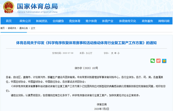 體育總局關(guān)于印發(fā)《科學(xué)有序恢復(fù)體育賽事和活動推動體育行業(yè)復(fù)工復(fù)產(chǎn)工作方案》的通知