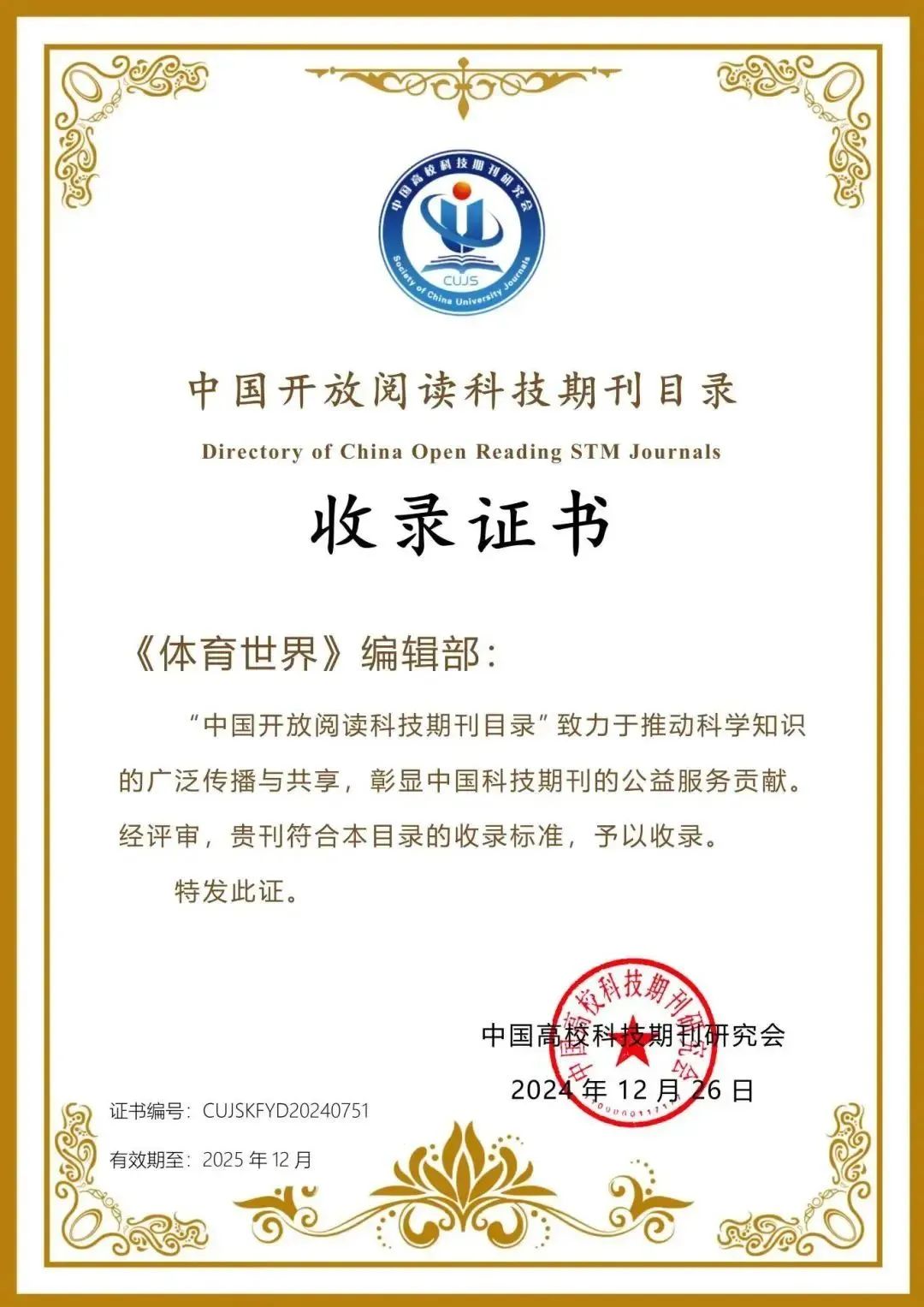近日《體育世界》雜志成功入選“中國開放閱讀科技期刊目錄”。